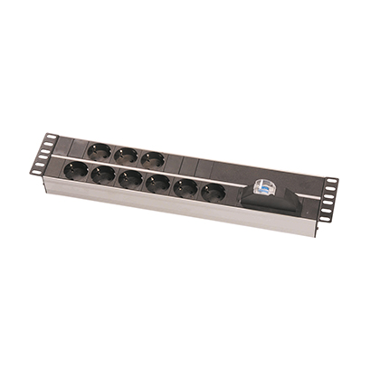 1U, 9'lu grup priz. 19", Aluminyum profil gövdeli, 1x16A sigorta korumalı, 9xDIN49440 schuko tip, 16A 250V Ac, 3.5 kW, 3x1, 5mm2, 2m kablolu, DIN49441 fişli |